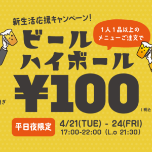 【浜松町ネオ横丁】4/3~4/30平日夜限定で、100円ビール&100円ハイボールイベントを開催