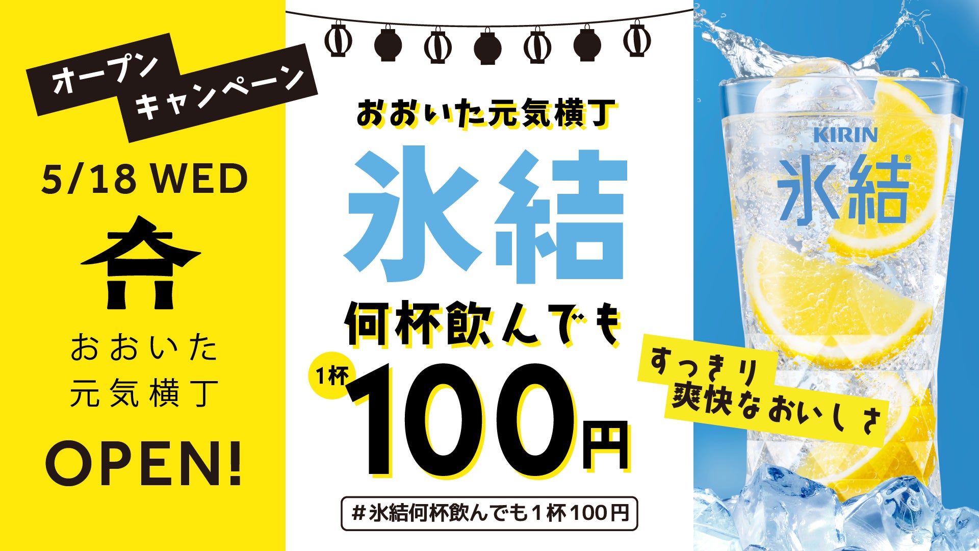 オープンを記念し、杯数や時間の制限なく、キリン氷結を1杯100円で提供するキャンペーンを実施いたします。店内に設置してあるQRコードを読み取り、無料で会員登録をしていただくと「氷結レモン」「氷結無糖」の2つの対象商品をご注文毎に1杯100円で提供いたします。キャンペーン実施期間は6月17日(金)までとなりますので、ぜひこの機会にご来店くださいませ。