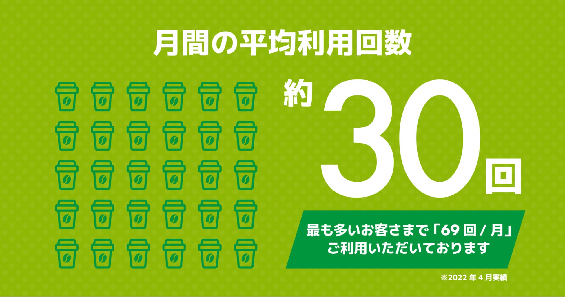 また、『NewDays カウンターコーヒープラン』の月間の平均利用回数は「約30回/月」と高く、最も多いお客さまで「69回/月」ご利用いただいております。