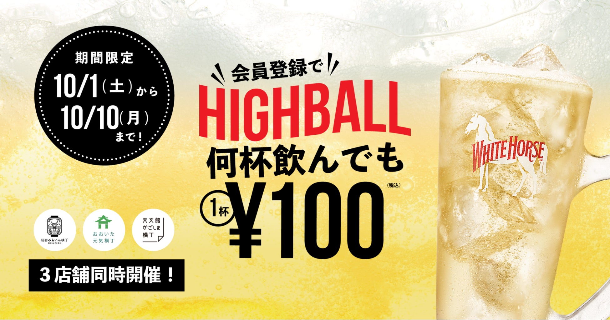 以前実施した「横丁100円ビール」キャンペーンが大変好評でしたが、お客さまからの「ビール以外のメニューも欲しい」との声にお応えし、この度「横丁100円ハイボール」キャンペーンの実施を決定いたしました。ご自身のスマートフォンで『横丁パス』へ会員登録をしていただいた方には、通常380円(税込)の「WHITE HORSE(ホワイトホース)」ハイボール(380ml)を、期間限定で一杯100円(税込)で販売いたします。一杯につき280円もお得に飲むことができます。ぜひこの機会に、各横丁へ足をお運びください。