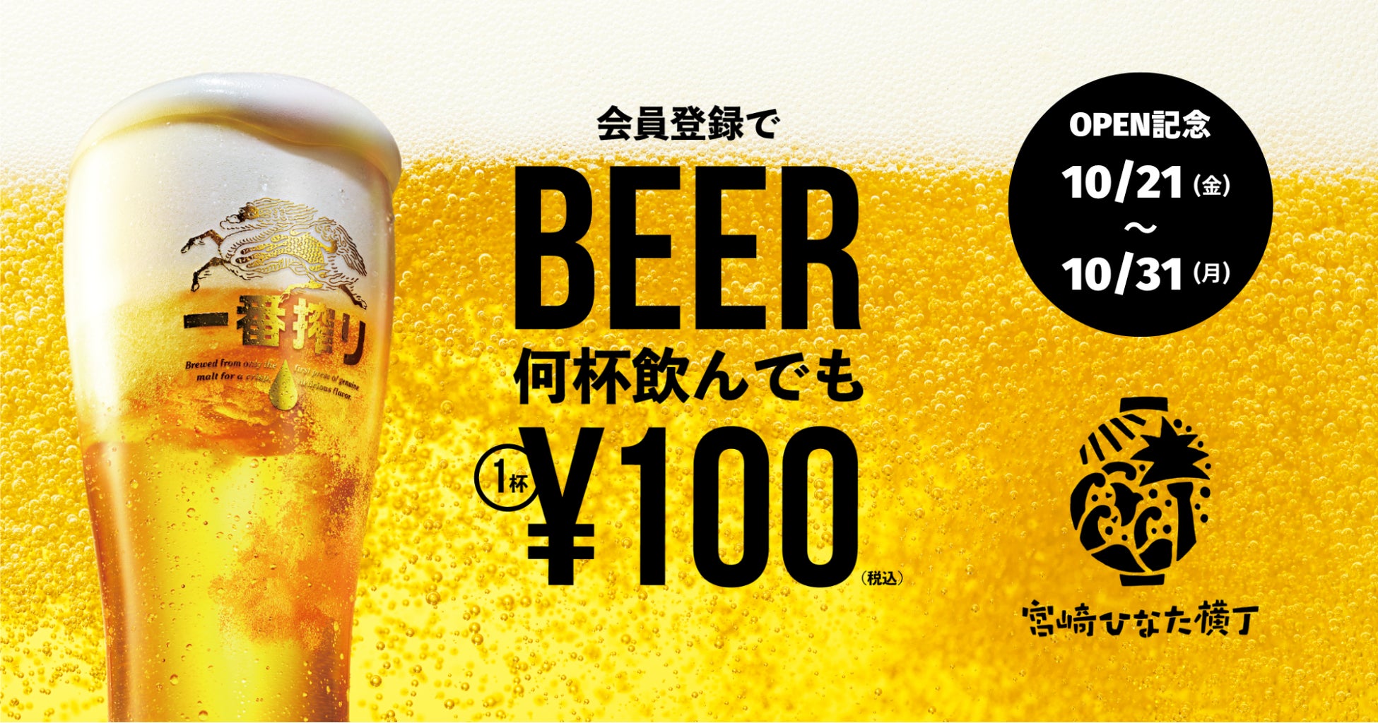 全国でシェア型レストランを運営する株式会社favy(代表取締役社長:高梨 巧、本社:東京都新宿区)は、宮崎県宮崎市の「宮崎ひなた横丁」を2022年10月21日(金)にオープンいたします。この度、キリンビール株式会社、JA宮崎経済連とタッグを組み、農家生産者から飲食店まで巻き込んで、外食業界を盛り上げます。また、オープンを記念し、10月21日(金)から10月31日(月)までの期間限定で、『宮崎ひなた横丁オープン記念 生ビール100円キャンペーン』を実施いたします。ぜひこの機会に足をお運びください。