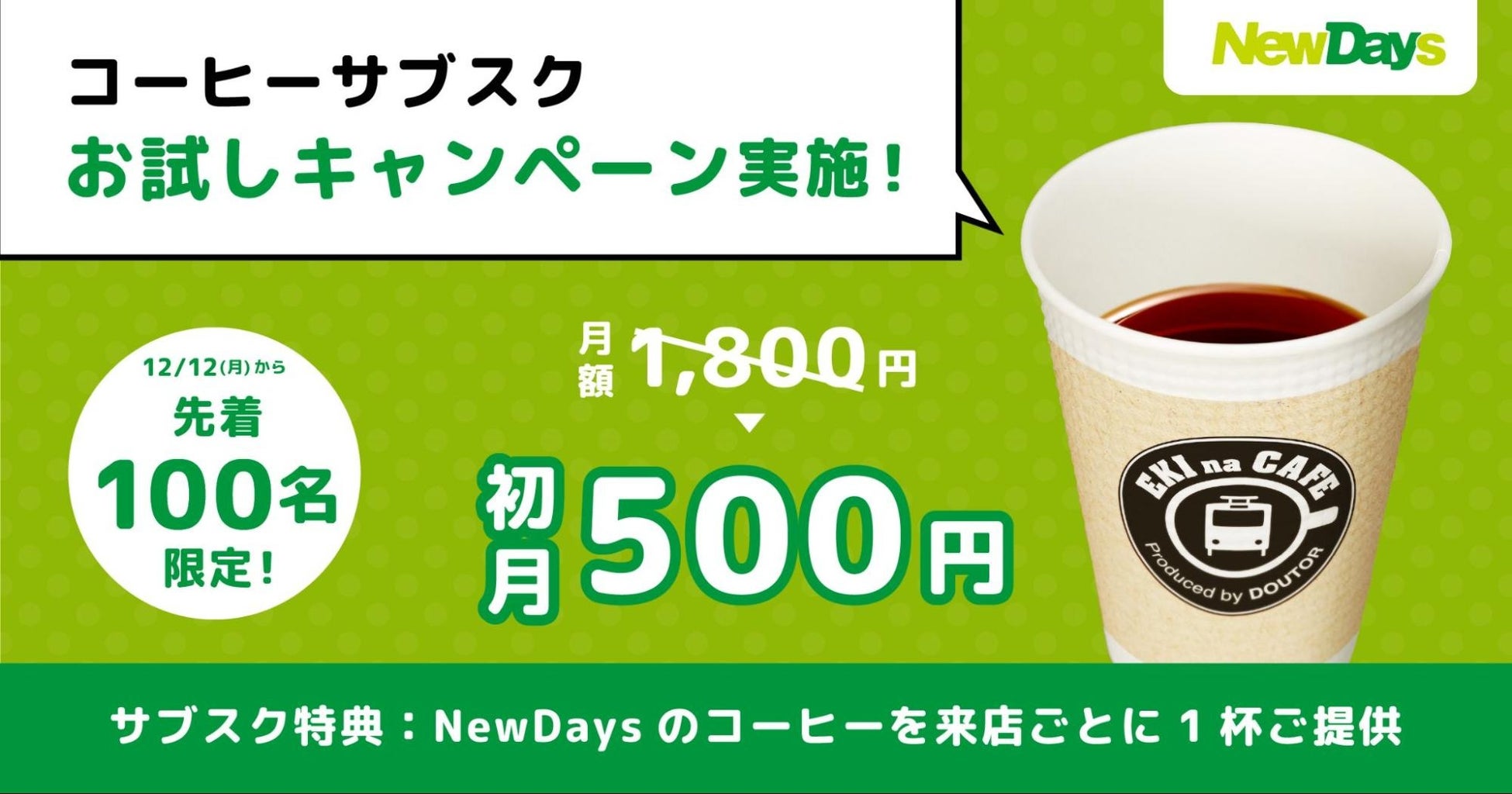 「NewDays」では、月額1,800円(税込)でコーヒーを来店ごとに受け取れる『NewDays カウンターコーヒープラン』を提供しています。この度、より多くのお客さまにNewDaysのサブスクサービスを利用していただきたく、12月12日より、通常月額1,800円(税込)の『NewDays カウンターコーヒープラン』が先着100名さま限定で「初月のサブスク利用料が500円(税込)」になるキャンペーンを実施いたします。