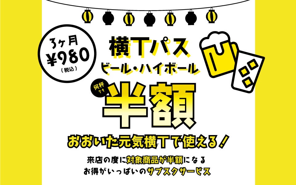 横丁をより身近に使っていただくためのサブスクリプションサービスです。登録いただき会員券を提示すると、対象ドリンク(キリン一番搾り、ホワイトホースハイボール)を、利用回数/杯数の制限なく半額でご提供いたします。ぜひ、新店メニューと一緒にご利用ください!