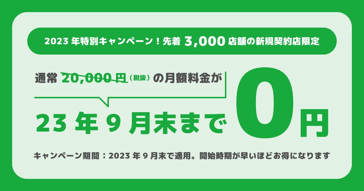 ・キャンペーン内容:通常月額20,000円/1店舗のシステム利用料金が2023年9月末まで無償となります。