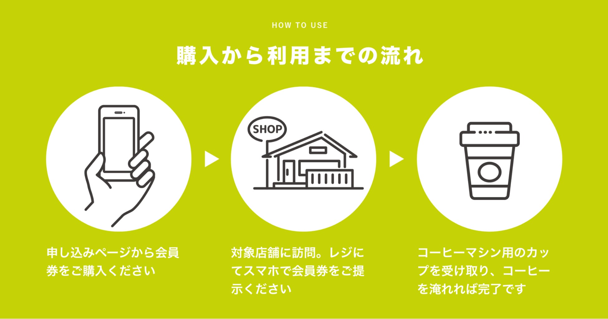 利用方法:対象店舗に来店し、レジにてスマートフォンの会員券画面を提示してください。コーヒーマシン用のカップを受け取り、コーヒーマシンでコーヒーを淹れれば受け取り完了です。