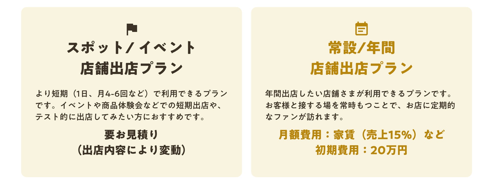 以前より「短期出店をしたい」という希望の声を多数いただいており、この度新たに「スポット/イベント店舗出店プラン」をご用意しました。イベントや商品体験会などでの短期出店、新業態や新商品のテスト出店をご希望される方におすすめです。少しでもご興味をお持ちいただいた方は、下記URLよりお気軽にお問い合わせください。