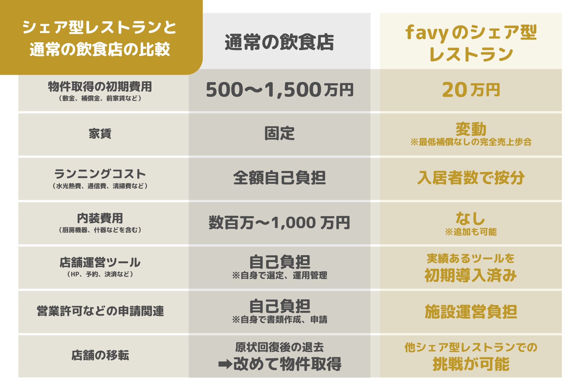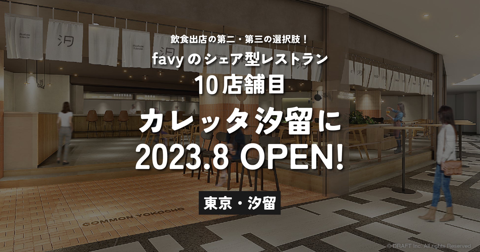 株式会社favy(代表取締役社長:高梨 巧、本社:東京都新宿区、以下favy)は、全国にシェア型レストラン/横丁を運営しております。この度、2023年8月に新たに東京・汐留のカレッタ汐留内にシェア型レストランをオープンする運びとなりました。favyは全国(鹿児島、大分、宮崎、宮城、東京都内)9館のシェア型レストラン/横丁を運営をしており、今回の発表は、累計10館目となります。favyのシェア型レストランは、飲食店出店の第二、第三の選択肢としてご利用いただけます。地方へ出店した後、東京・汐留、銀座エリアへの移動も可能です。さらに今回、新業態や新商品のチャレンジ出店、イベントポップアップ出店をご希望の方向けに「1日だけの利用、月4〜6のスポット利用」ができる新プランを提供開始します。入居する際の初期費用が20万円、家賃は売上にひもづく変動制という点が特徴のシェア型レストランを活用して新規出店に挑戦したい方からのご応募お待ちしております。