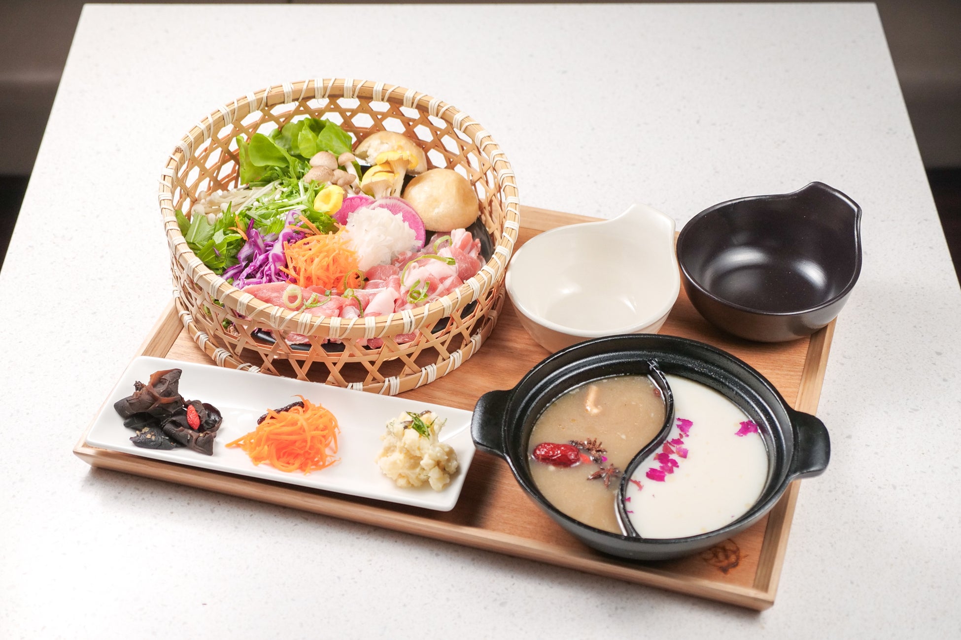 スープは、2種類でお楽しみください。1種類は「オリジナル薬膳鶏出汁」、もう1種類は、酒粕豆乳、麻辣湯、牛骨コラーゲン、黒胡麻坦々、薬膳鶏白湯の中からお選びいただけます。
