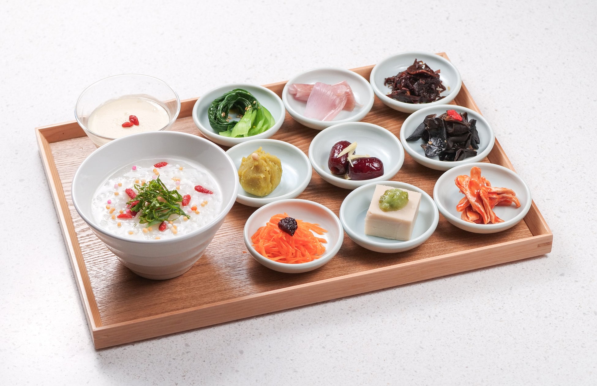希少鶏の出汁で煮たなつめ案オリジナルのお粥と、五季・五味・5色など薬膳が味わえる9品+デザート付きの粥膳。お粥はおかわりし放題です。