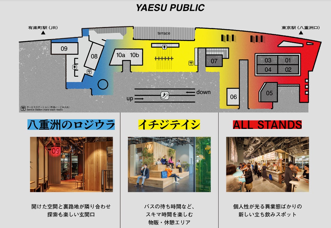 東京ミッドタウン八重洲2階の「ヤエスパブリック」は3つのエリアで構成されており、今回当社のモバイルオーダーシステムが採用されたのは「ALL STANDS」エリアとなります。