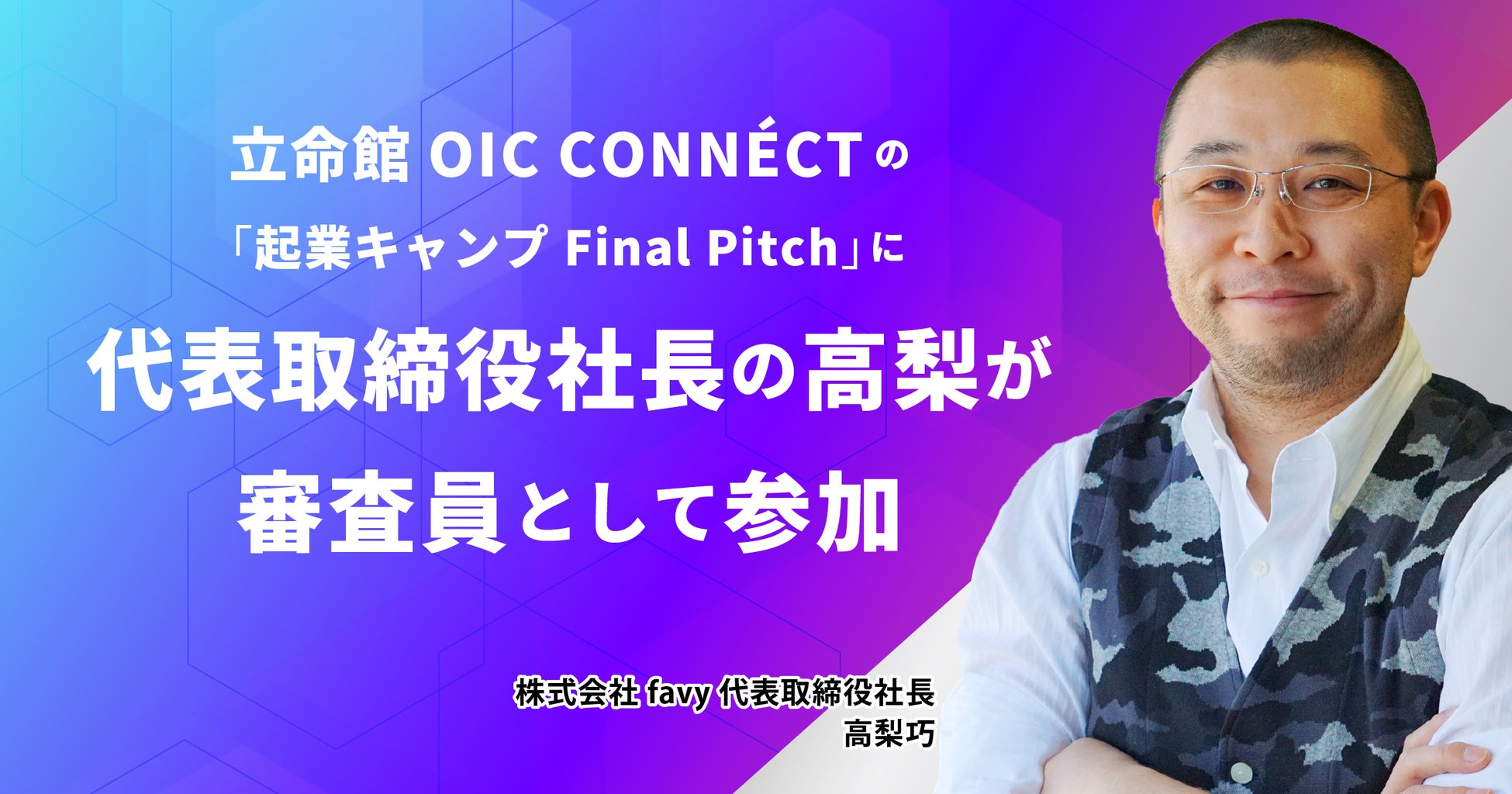 株式会社favy(代表取締役社長:髙梨巧、本社:東京都新宿区) は、2024年8月2日(金)に立命館大学いばらきキャンパスにて開催される「立命館OIC CONNÉCT」の「高校生向けアントレプレナーシップ教育企画:起業キャンプ Final Pitch」に、審査員として参加することが決定しましたのでお知らせいたします。